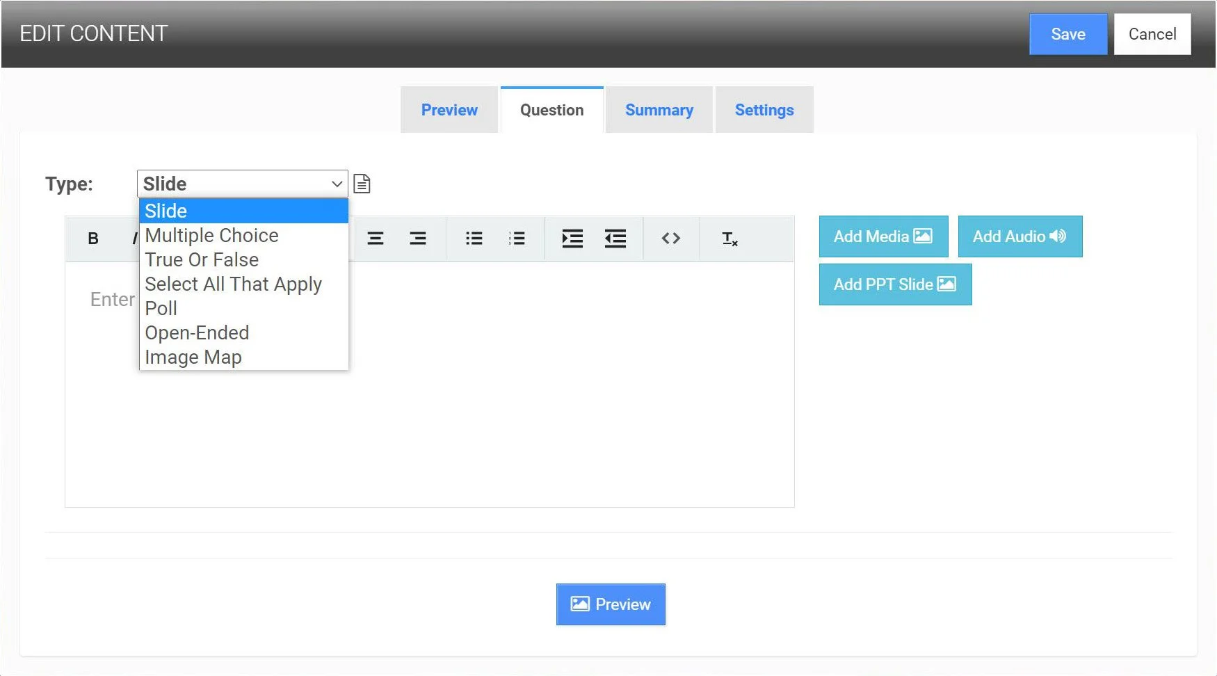 Like other platforms within the BRAVOZONE you have options of using Preview and Summary slides to add additional teaching points or additional information the users may need to answer a question. This includes videos, audio, text, and images (including PowerPoint slides).
