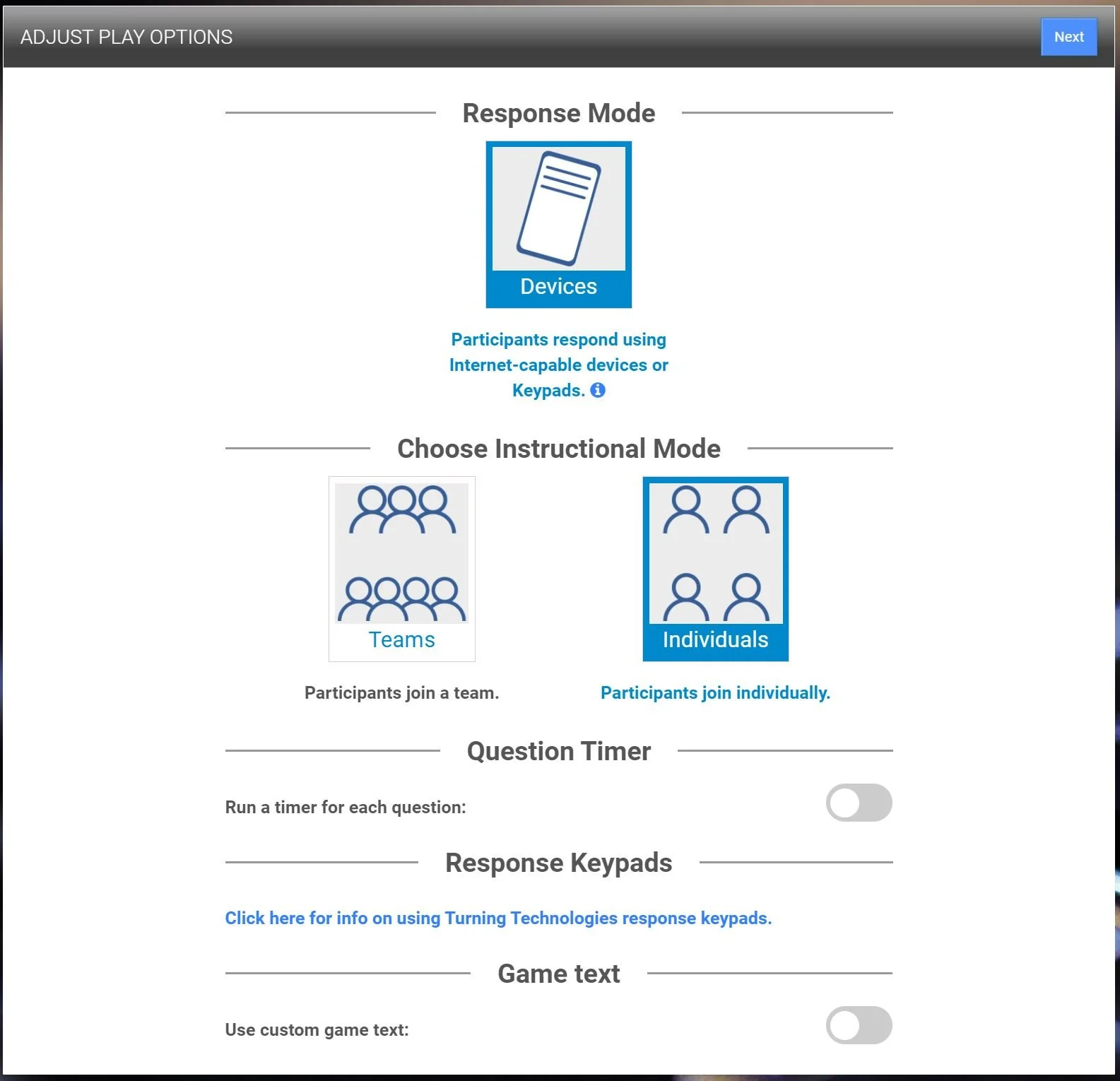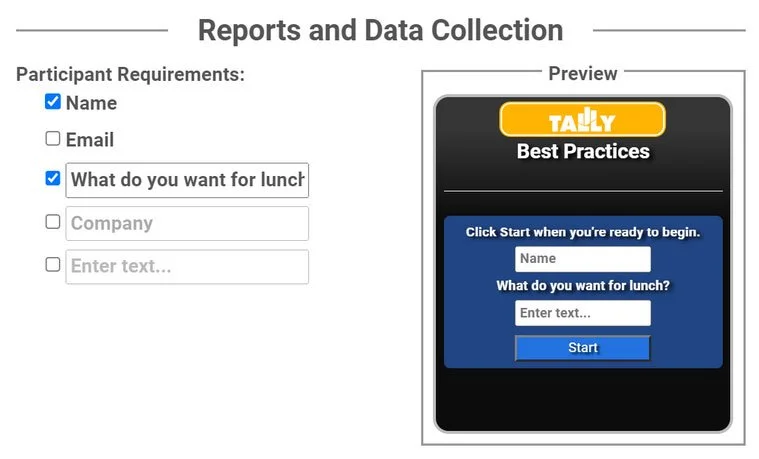 You can customize the Participant sign in options here. These are the fields a player will be asked before a session begin you can customize three of these fields or even ask a question. In the image below you will see we added a question for the audience to answer prior to the session. This will show up in the reports. You can use them all or no fields at all.