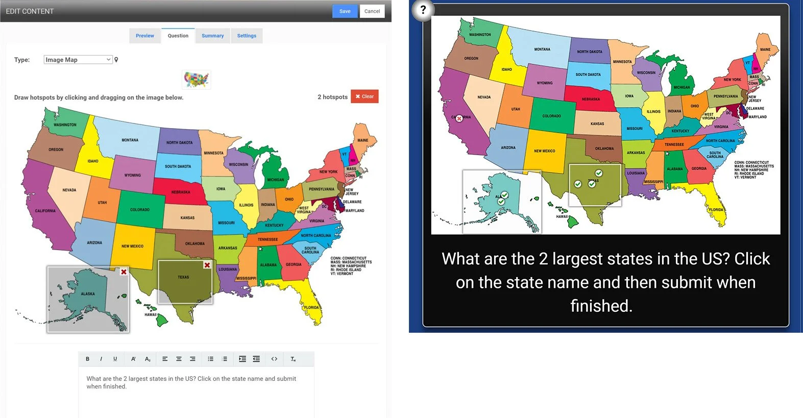 Multiple Hotspots: You have the option to add more than one correct Hotspot in an image. For example, for the image below the question is “What are the 2 largest states in the US? Click submit when finished.” The image below shows the Image Map with 2 states selected and the question that will instruct the participants what the question is. Since there are 2 Hotspots the participants will need to select Alaska and Texas to get the answer correct. They will only be allowed to select 2 states since that is all the Hotspots that were selected in the Image Map.